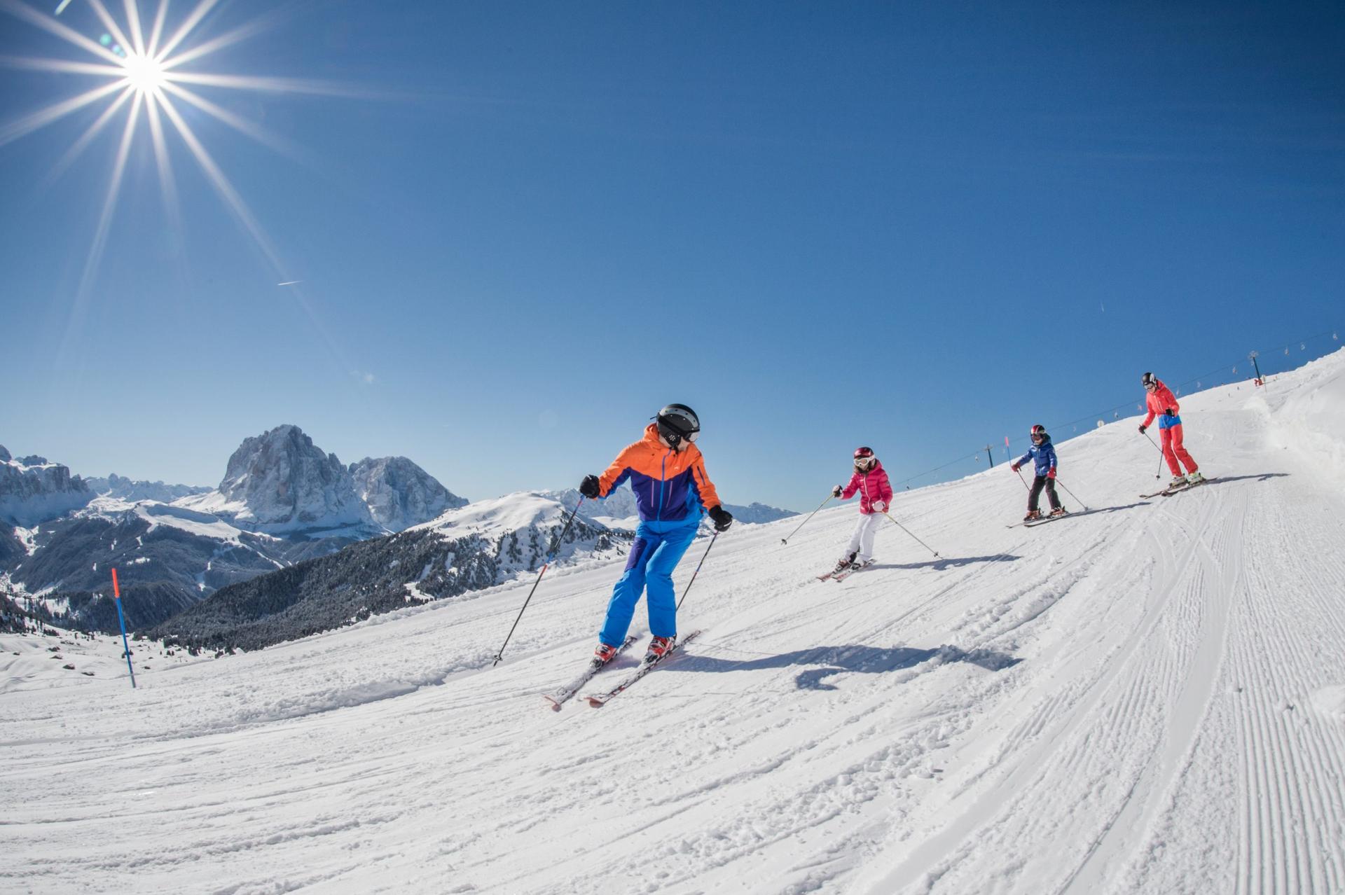 Skiers enjoying snowy slopes of Austrian ski resort Tux